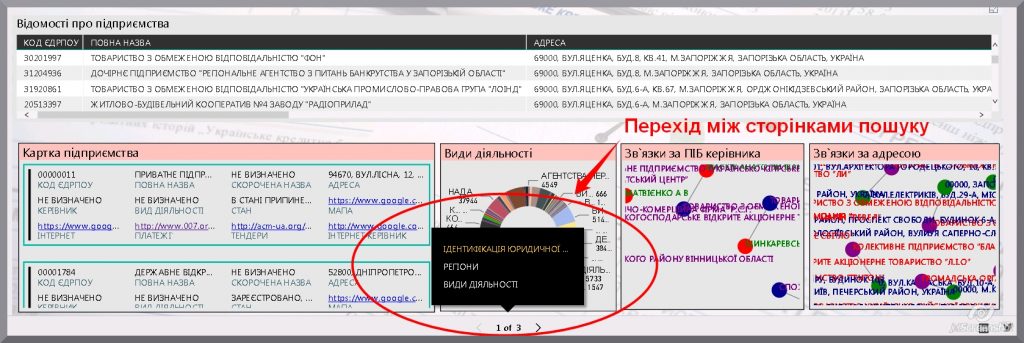 На поточний час систематизація відомостей з ЄДР та пошук по юридичним особам здійснюється на трьох сторінках , перейти до яких Ви можете натиснувши на посилання <1 из 3> та обрати необхідну сторінку. Зараз наявні сторінки «Ідентифікація юридичної особи», «Регіони» та «Види діяльності»