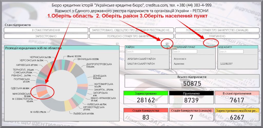Сторінка відображає статистичні показники по підприємствам у розрізі областей, районів, населених пунктів та станів підприємств. Пошук здійснюється аналогічним чином, як і на сторінці ідентифікації юридичної особи
