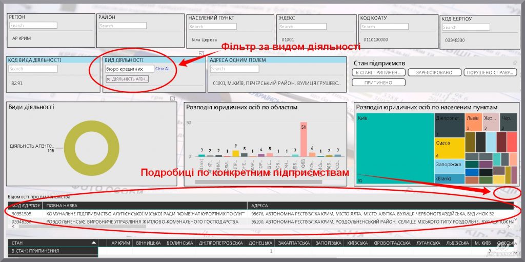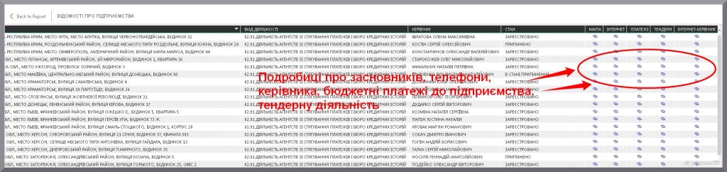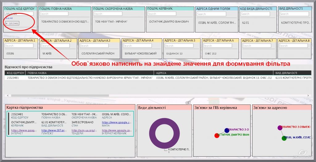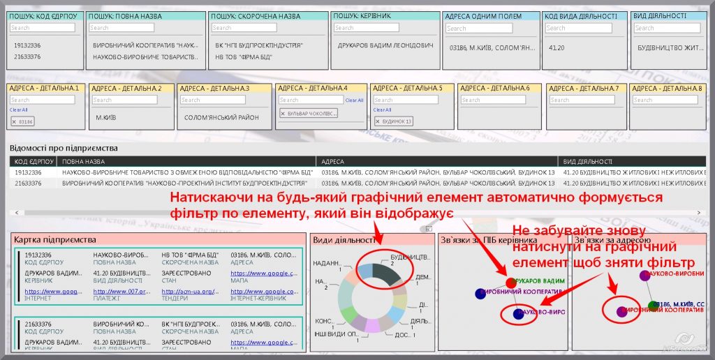 Сторінка буде корисна маркетологам або спеціалістам по роботі з клієнтами. В декілька кліків можливо знайти контакти, адреси, керівників за різноманітними показниками