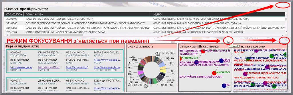 Для всіх елементів меню, графіків та візуалізації зв`язків є одне важливе правило відображення — це РЕЖИМ ФОКУСУВАННЯ. Він знаходиться у правому верхньому кутку кожного елементу, з`являється на екрані при наведенні на нього та дозволяє відчиняти на весь екран обраний елемент для зручного перегляду, вводу даних або аналізу