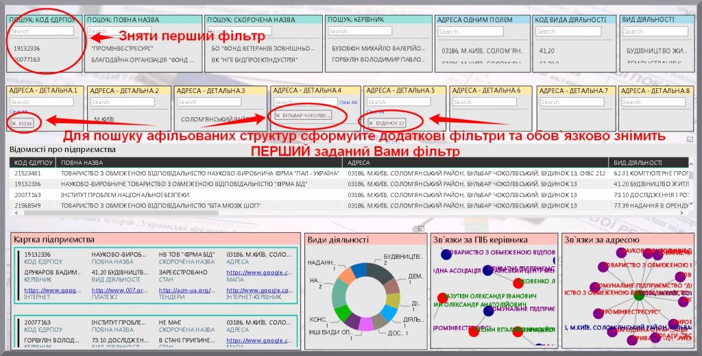 Для подальшого пошуку афільованих сруктур по адресам, керівникам, видам діяльності, необхідно сформувати аналогічним чином фільтри та обов`язково очистити перший заданий фільтр (У іншому випадку за пошуковими критеріями буде знаходитись тільки перше підприємство як таке що відповідає усім пошуковим ознакам)