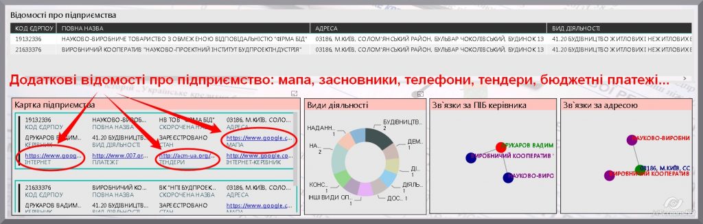 Елемент «Картка підприємства» дозволяє в один клік сформувати додаткові пошукові запити по зовнішніх масивах інформації, подивитись місцезнаходження підприємства, знайти засновників, телефони та додаткові відомості, переглянути платежі на це підприємство з боку бюджетних установ, участь підприємства в тендерах, а також ознайомитись з інформацією про керівника підприємства